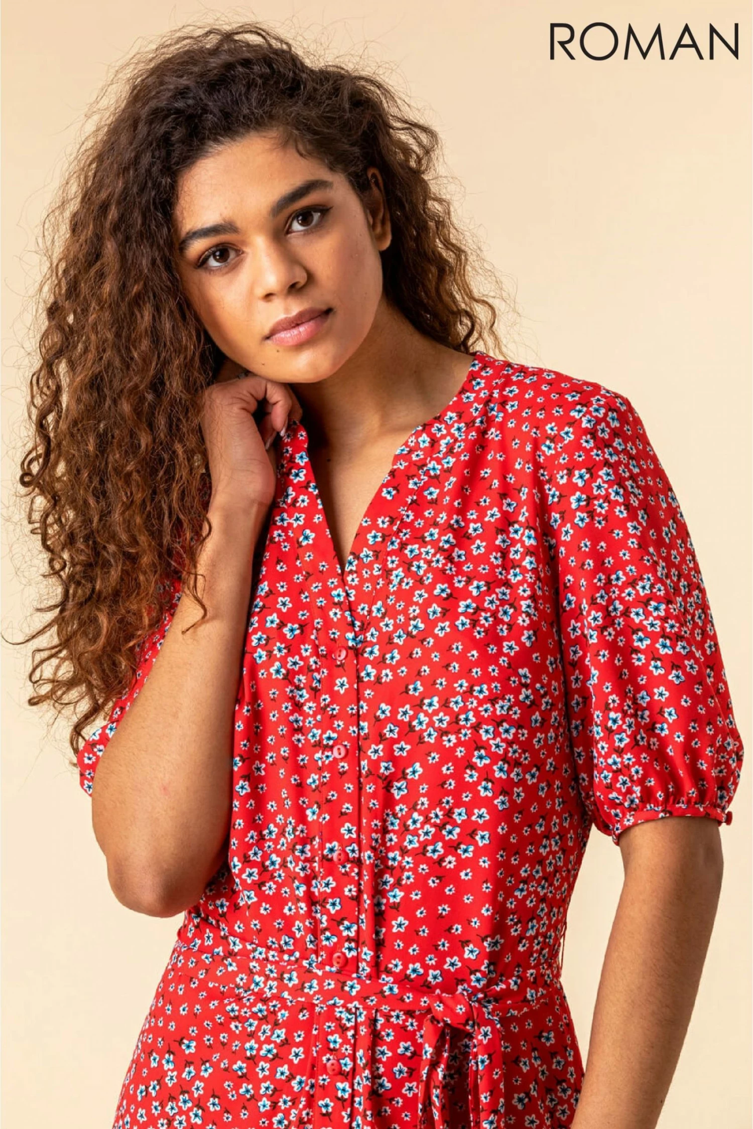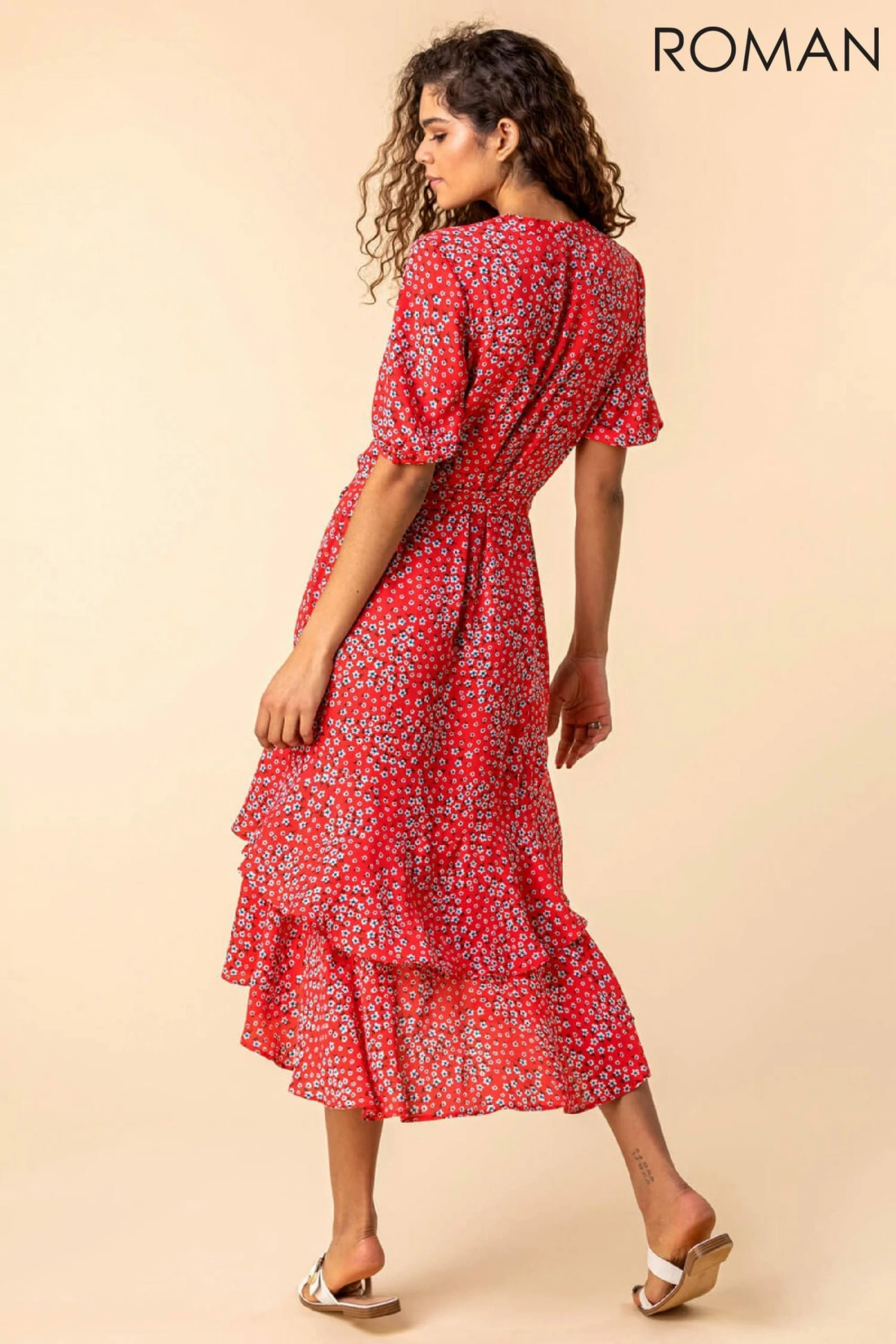 Dress to impress this season in our floaty floral frilled hem dress and perfect the picnic look with a Roman favourite. Adorned in an all-over ditsy floral print, our double-frilled hem frock has short blouson sleeves and a beautiful button fastening to the front, inspired by the on-trend shirt-dress style. Tied at the waist with a matching fabric belt, you can wear this piece within your everyday casual wear or dress up with heels and a clutch for that upcoming summer occasion.