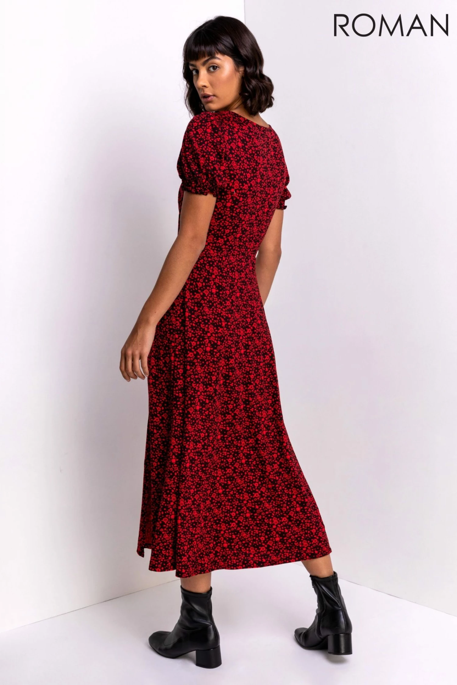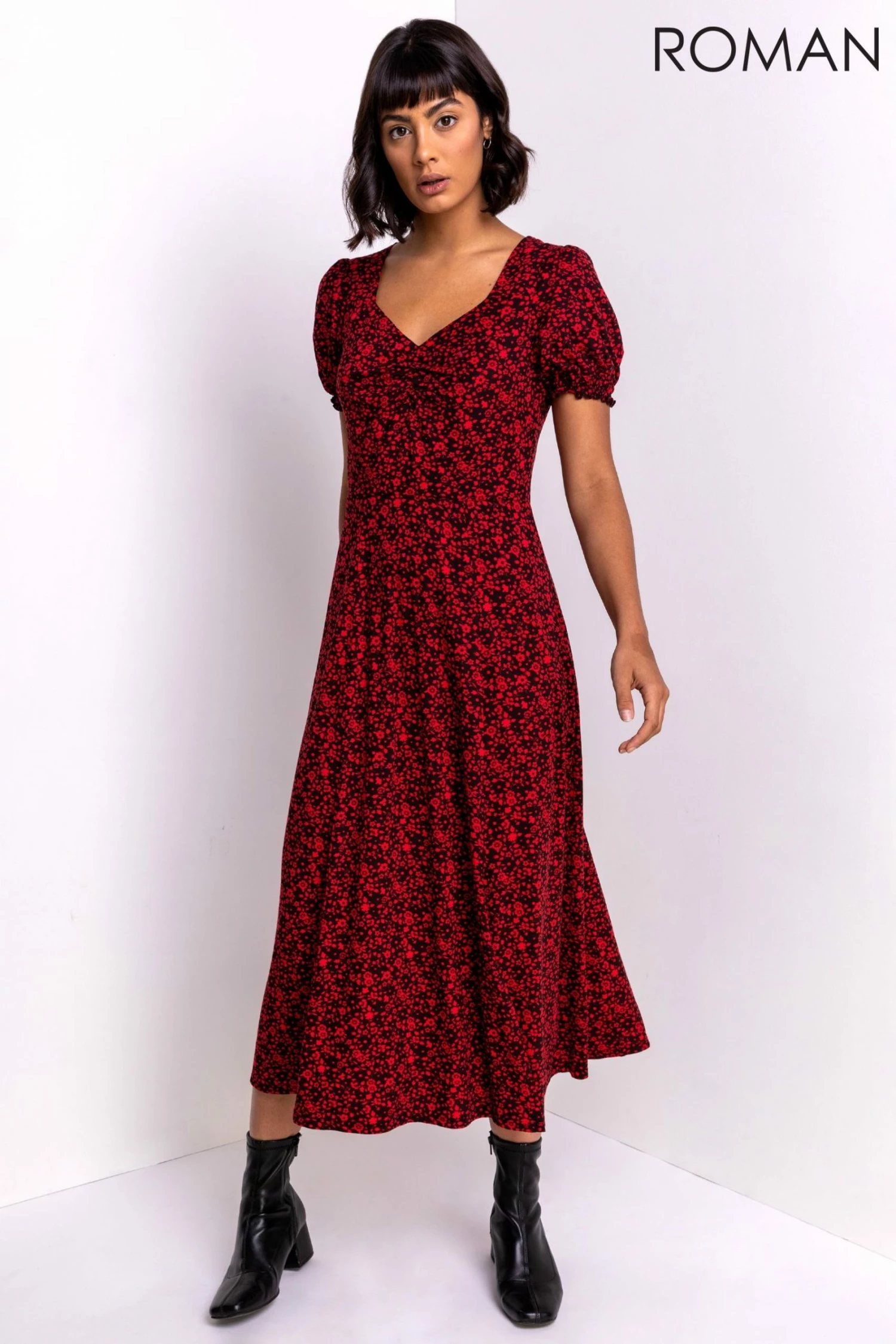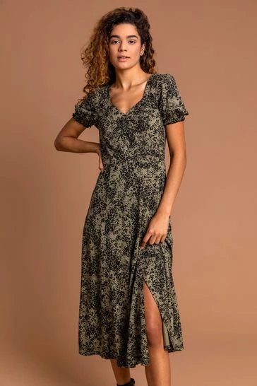 Flatter your figure in feminine prints this season with our floral midi length dress. Featuring front splits to the side of the skirt and elegant shirred sleeves & cuffs, this day dress has beautiful gathered detail to the bust creating a sweetheart neckline. Pair with everyday pumps for a casual day look or dress up with heels and statement jewellery for an occasion-ready outfit.