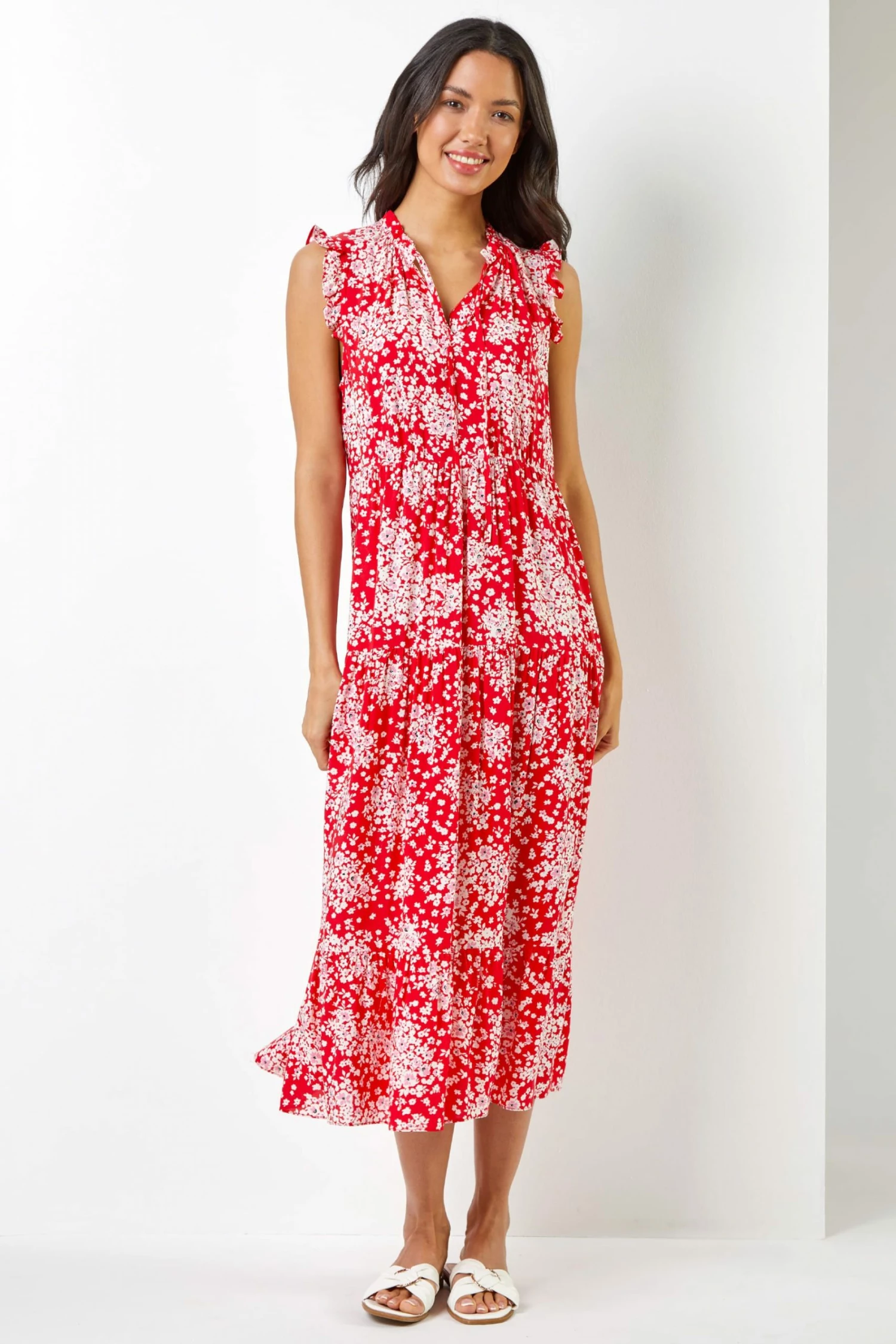 Flourish in florals with this exquisite Roman maxi dress. Made with such a seamless silhouette, with frill detailing along the neckline and arm holes, with a neck tie detail that flows into a flattering tiered skirt. This dress is the ideal piece for this upcoming season, elegant and equally stunning, it’s a dress that needs minimal styling. Pair it with some sandals and a crossbody for a made up day look or wedges and a sun hat for an effortless summer look!