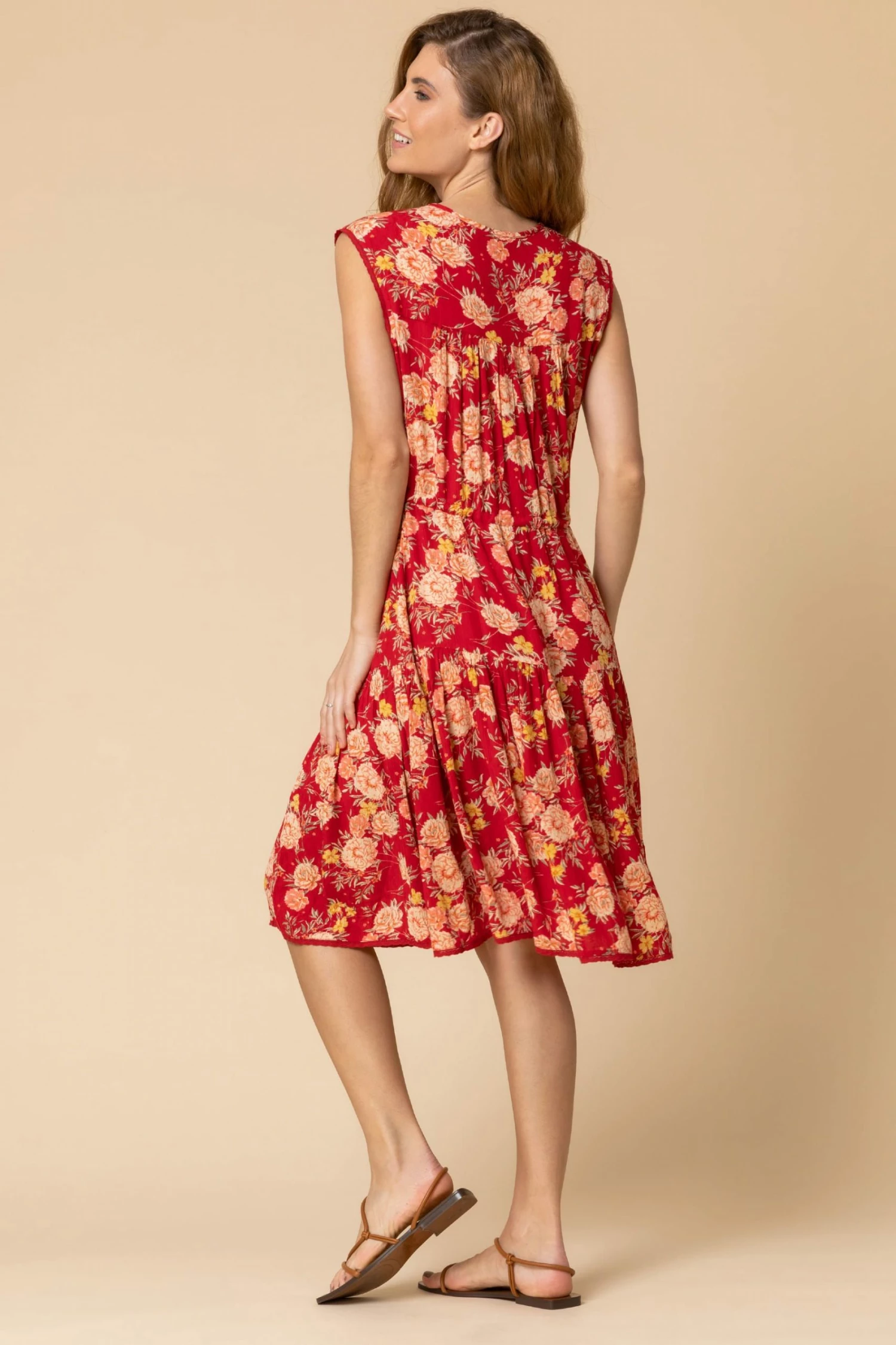 We just know you ll love this summer dress. This red floral is playful, lightweight and means it won t take much effort for you to achieve the perfect summer look! This drawstring knee-length dress features a notch neckline, sleeveless, with a gather detail seam line across the skirt and a drawstring waist to enhance the figure. Throw on your favourite chunky white trainers or slides for the perfect summer outfit!