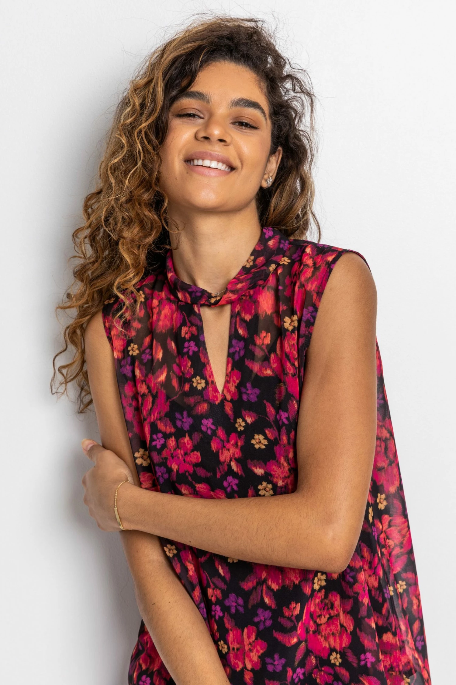 Our newest chiffon blouse is adorned in the most delicate floral print with a fabulously feminine keyhole neck. Abstract in print and design, this asymmetric top has a floaty chiffon overlay and sleeveless body, making it perfect for layering up with jackets for any occasion. A twist detail at the neck finishes off this look and gives a unique look to your eveningwear. Smarten it up with a blazer jacket and faux leather trousers for an evening out with friends.