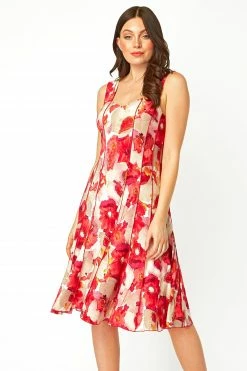 Go for bold with this stunning statement floral print panel dress in hues of red. Crafted with silhouette defining panels, a floaty skirt and wide straps, this soft stretch jersey dress is perfect for all occasions this summer.