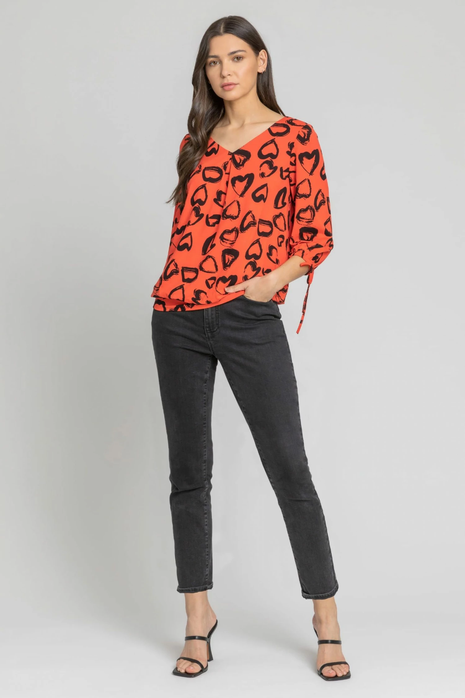 Follow your heart with this dreamy emerald love print blouse. Adorned in a striking romantic print with feminine tie details, this light jersey style is easy to dress up or down, whatever the occasion. This stretchy style has a blouson hem band for a flattering fit and easy 3/4 length sleeves. Style this with jeggings and pumps for a day to night look all year round.