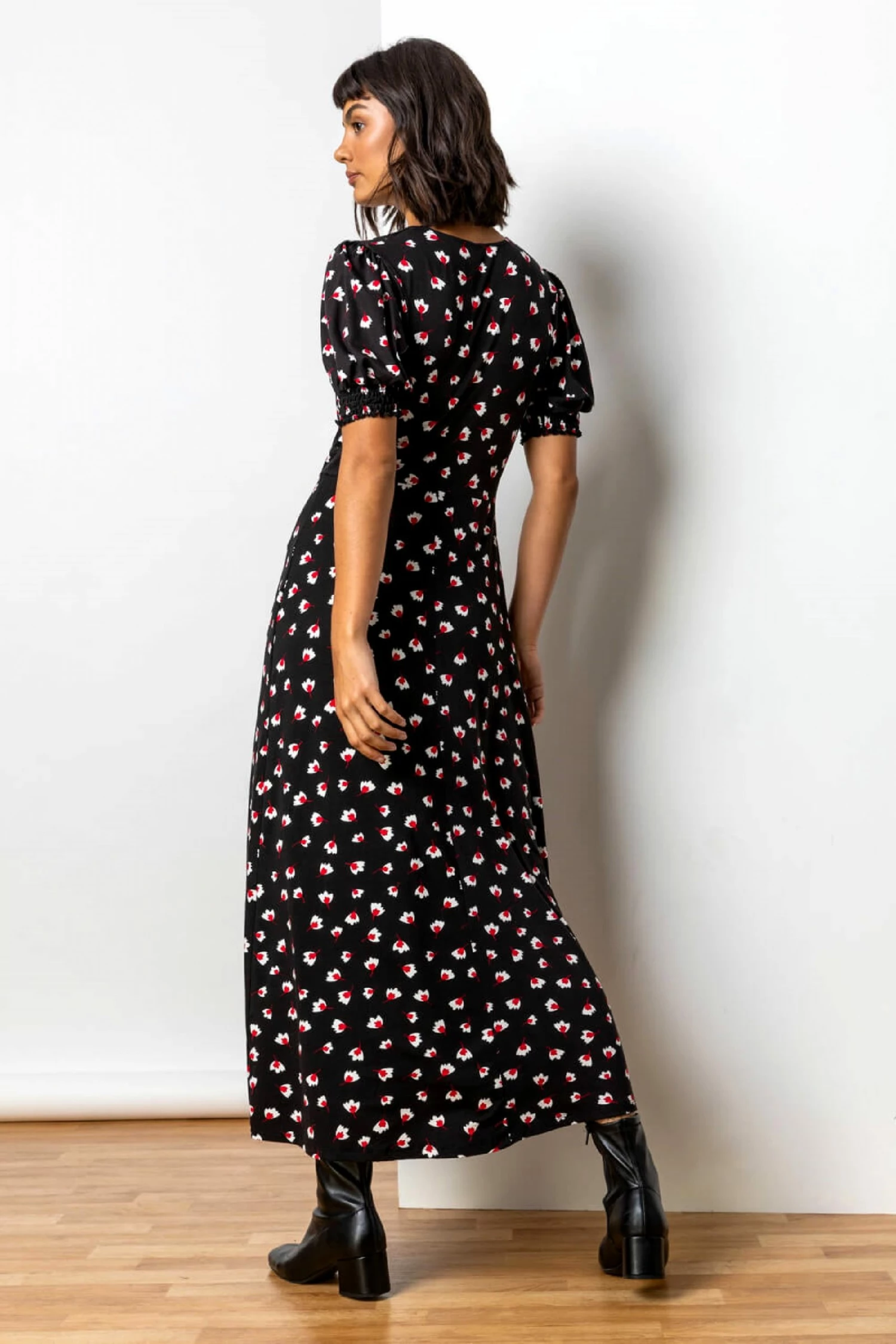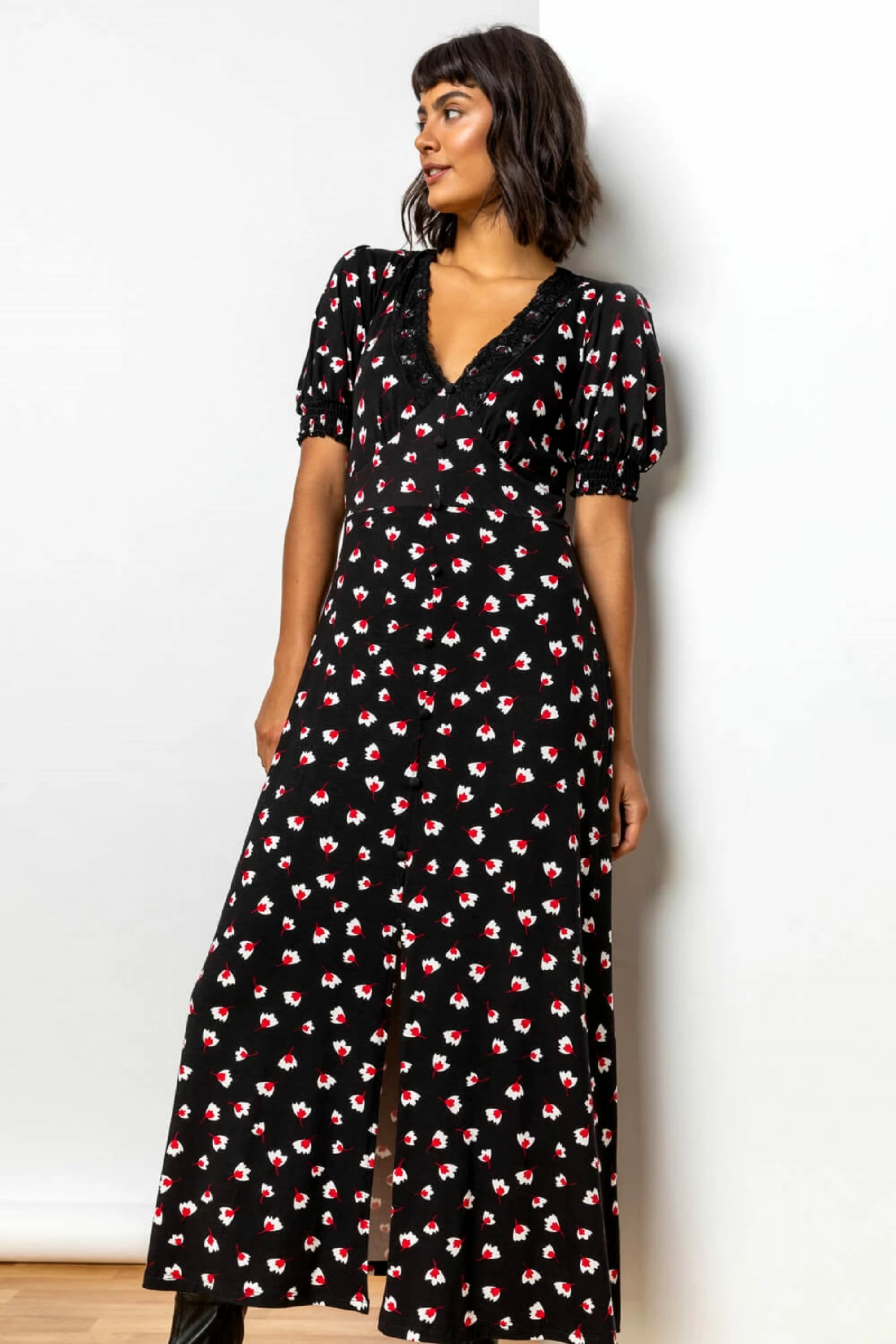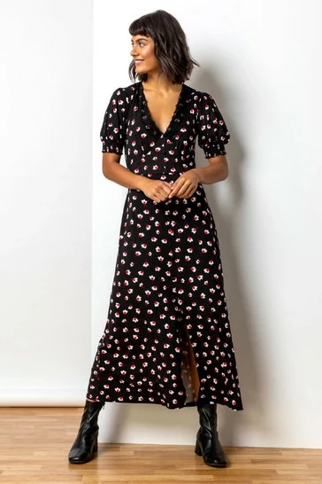Look no further than this printed tea dress. Featuring short sleeves, deep v-neck traced with a lace overlay and tailoring at the shoulder to frame and flatter your upper body. With self covered buttons and a front split this dress is a show stopper that can take you from a picnic in the park, to a evening party.