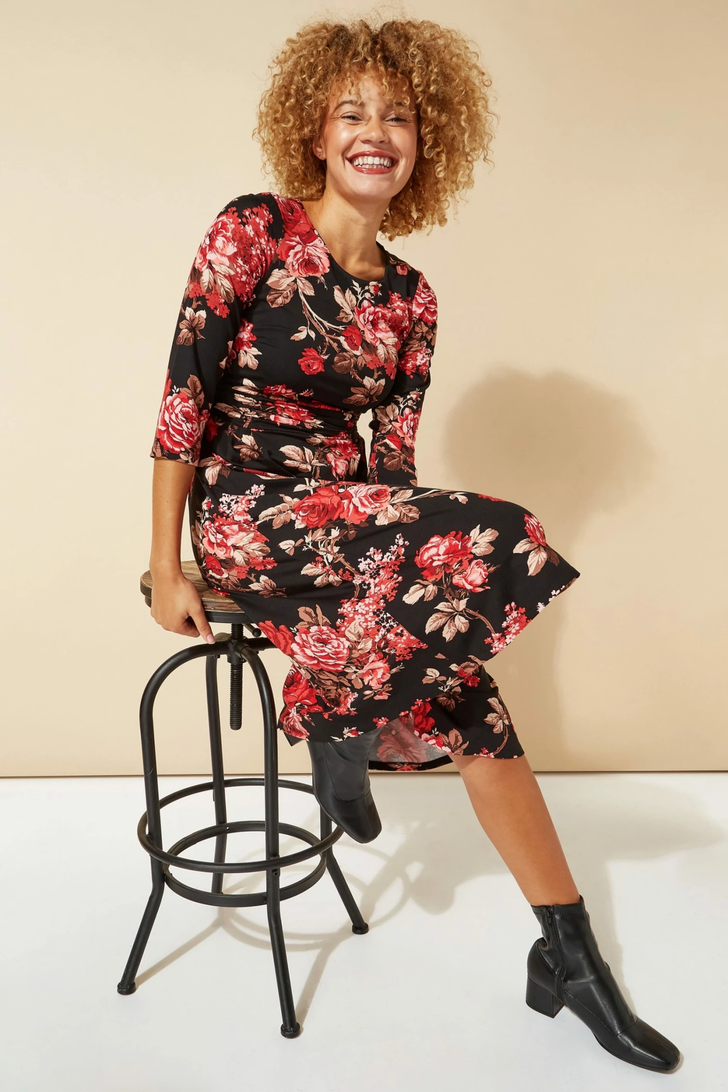 Catch everyone’s eye in this vibrant floral print dress. Finishing at a demure midi length, this round neck dress has two functional side pockets and is subtly gathered at the waist in a flattering fit and flare silhouette. Let this bold dress do all the talking and keep it simple with a classic black jacket and court heels for a look that’s ideal for the office and those after work dinner plans.