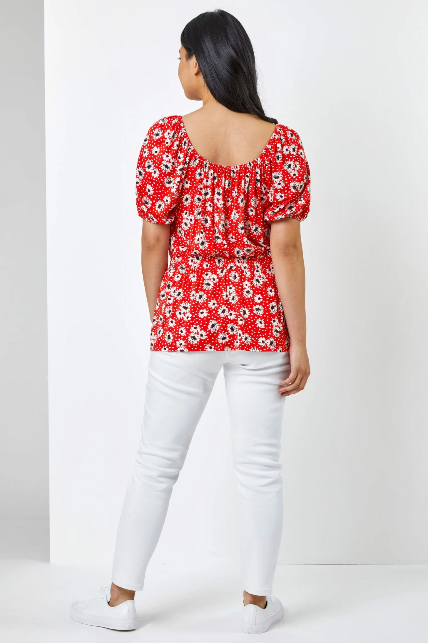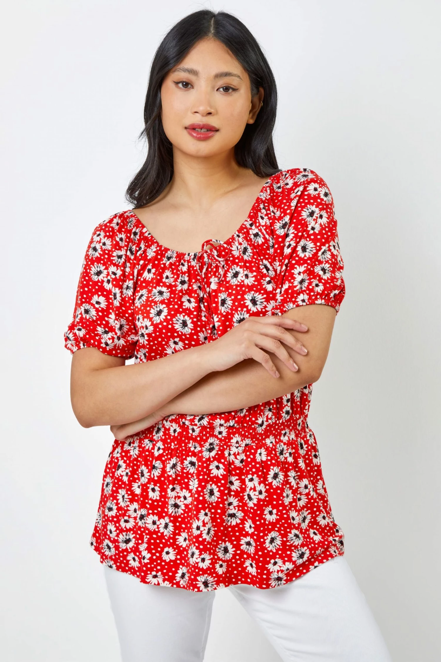 Cinching in your waist with a comfortable shirred middle, this new Petite top is a real spring summer staple. A ditsy floral spot print finishes this easy breezy style with its stretchy body and elasticated neckline great for wearing two ways. Pull off the shoulders for a flattering summer look or keep it up to create a flattering round neckline. Ideal for any occasion, this tie detail top can be dressed up with jeans and heels for brunch with the girls or worn casually over shorts for an easy holiday outfit.