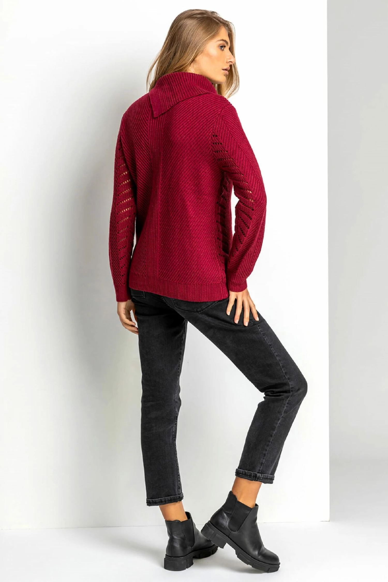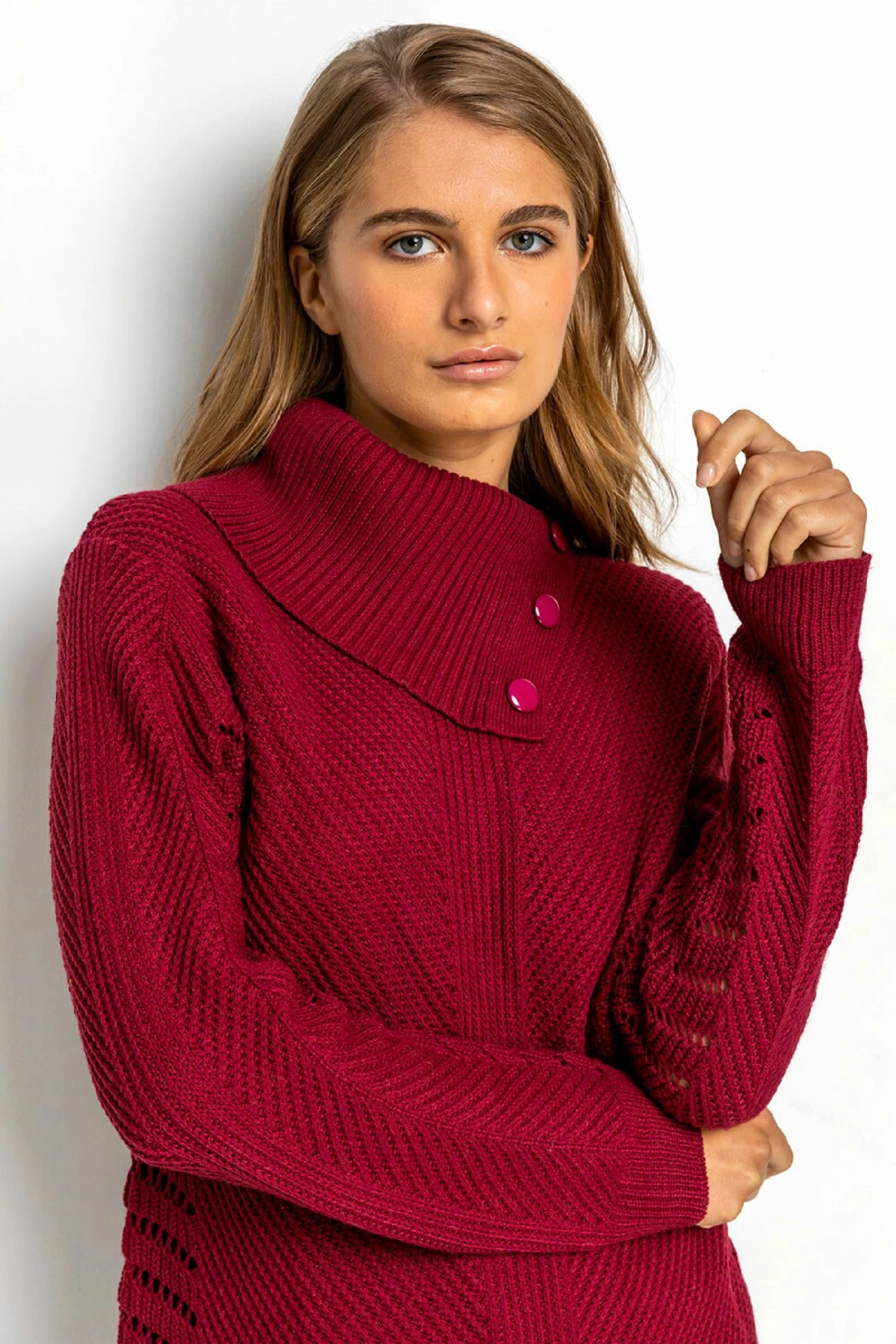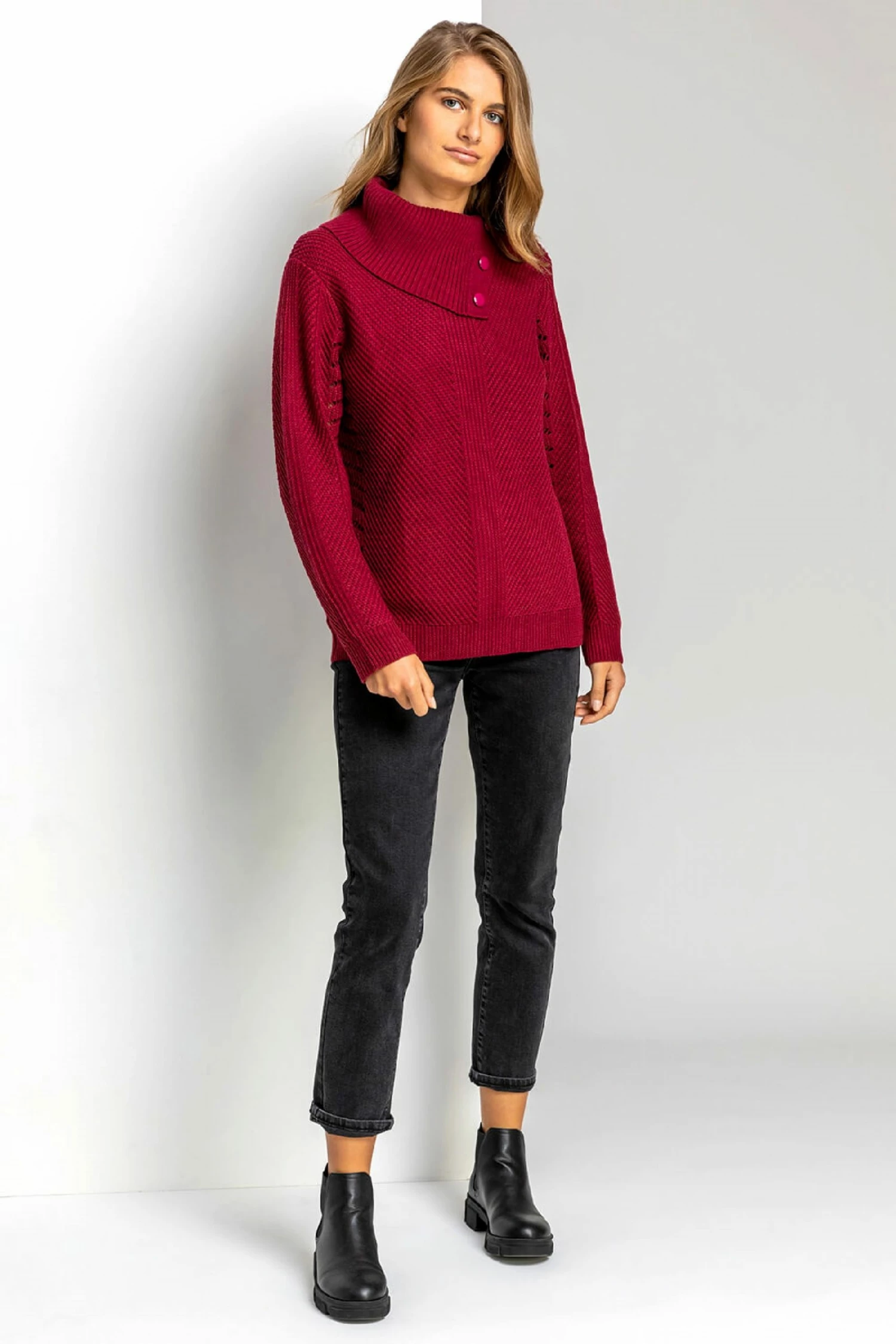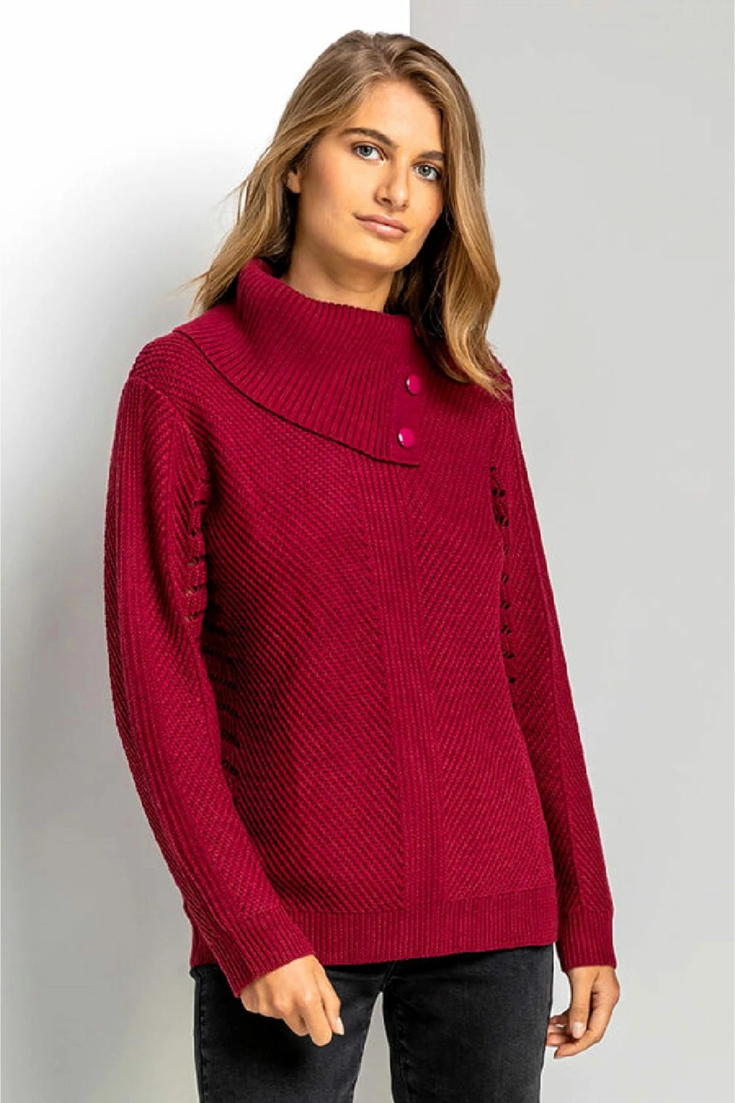 Cuddle up for autumn with this stylish cowl neck jumper. A unique twist on a bestseller, this long sleeve knit has a button detail at the neckline and quirky pointelle sleeves and body. A flattering slash neck and delicate pointelle texture add a touch of feminine flair to this chunky sweater. In a gorgeous autumn hue that is so easy to wear over denim, this cuddle-worthy jumper is a real seasonal staple!