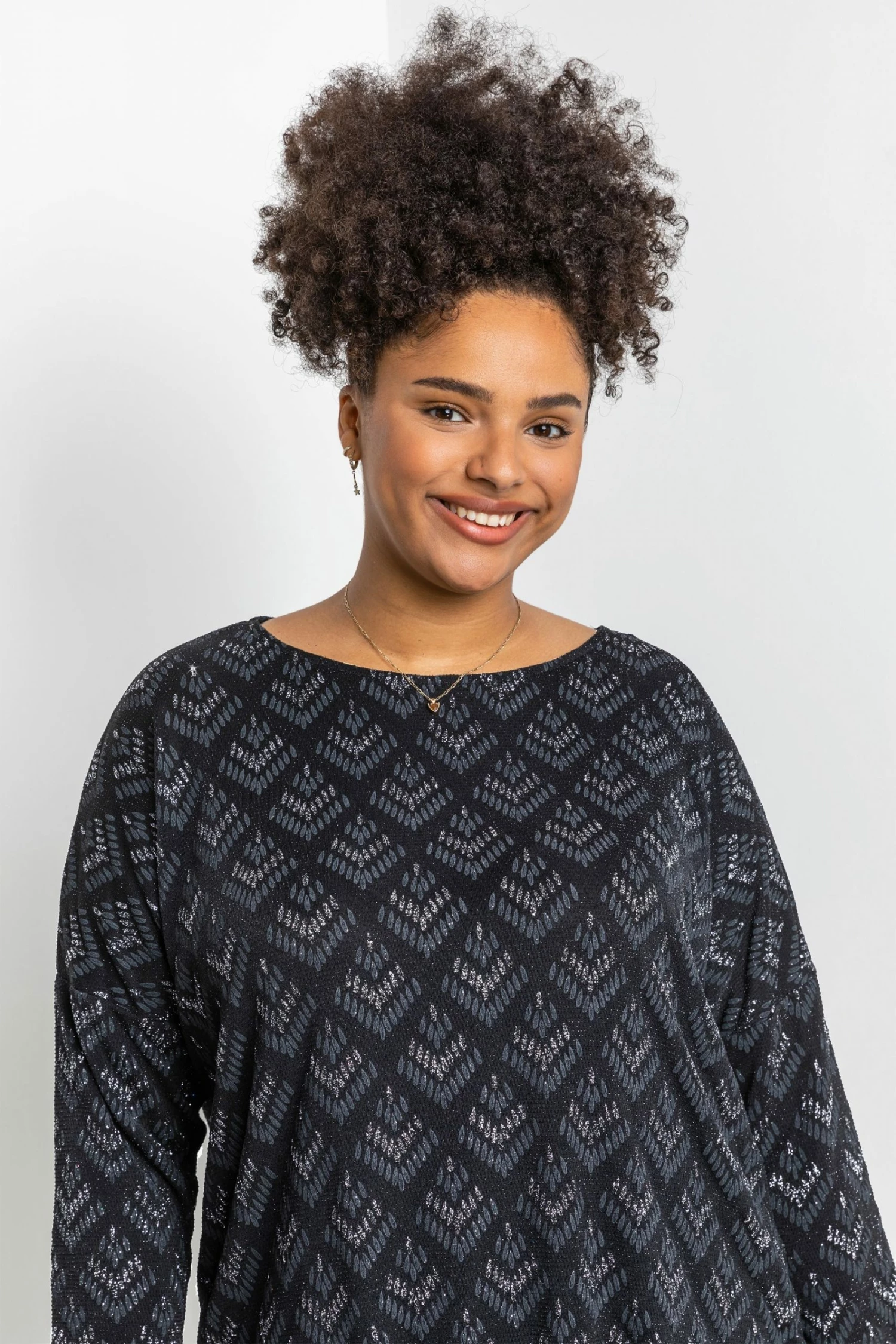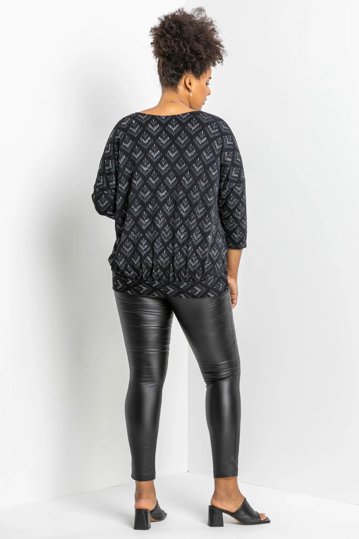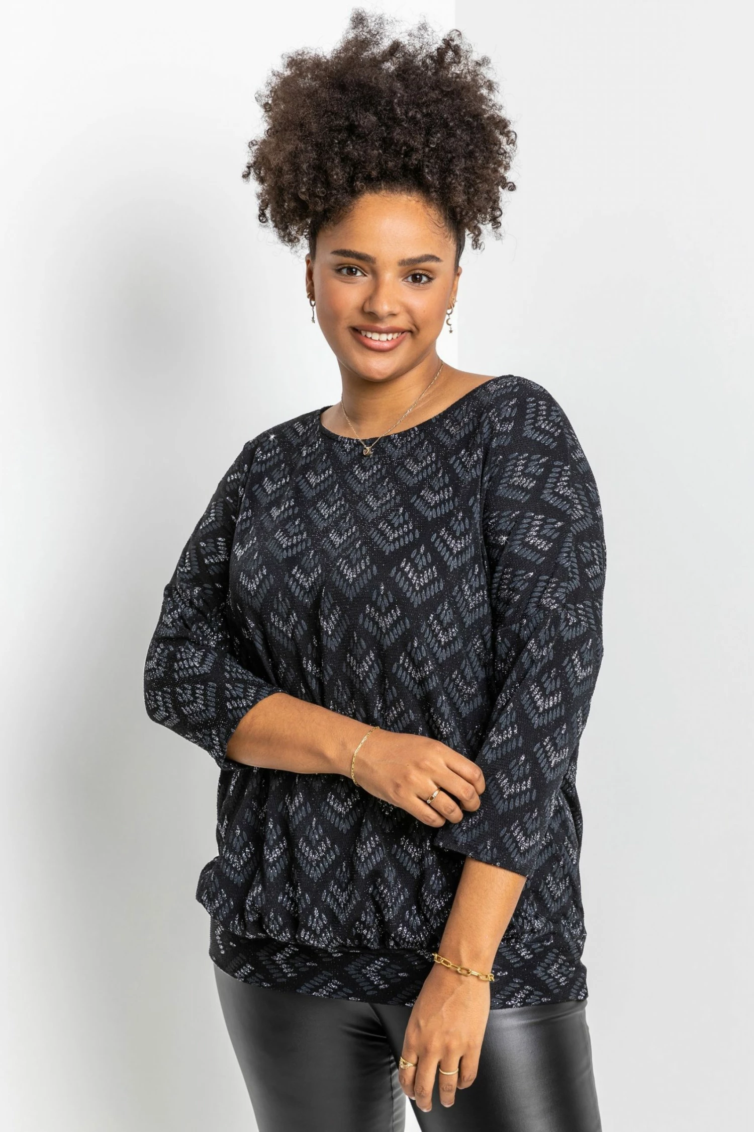 Beautiful blouson hemlines and shimmering fabrics are a party season staple! This Roman Curve jersey top is soft on the skin with its light stretch jersey and festive in the print with geometric glitter embellishment. A flattering wide hem creates a feminine silhouette and cinches you in whilst a bold geometric print adds some fun to your eveningwear. Style with your faux leather trousers for your next night on the town!