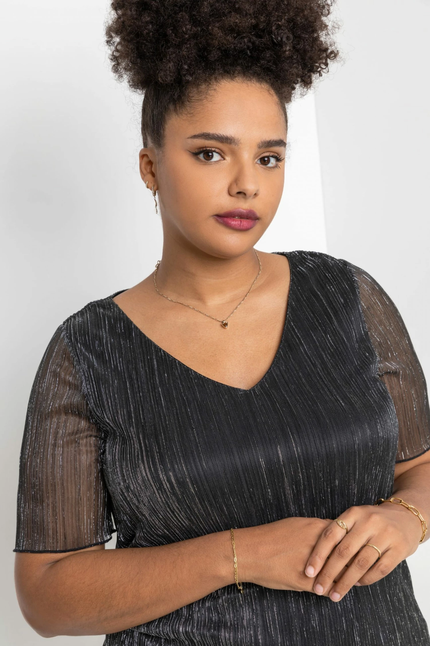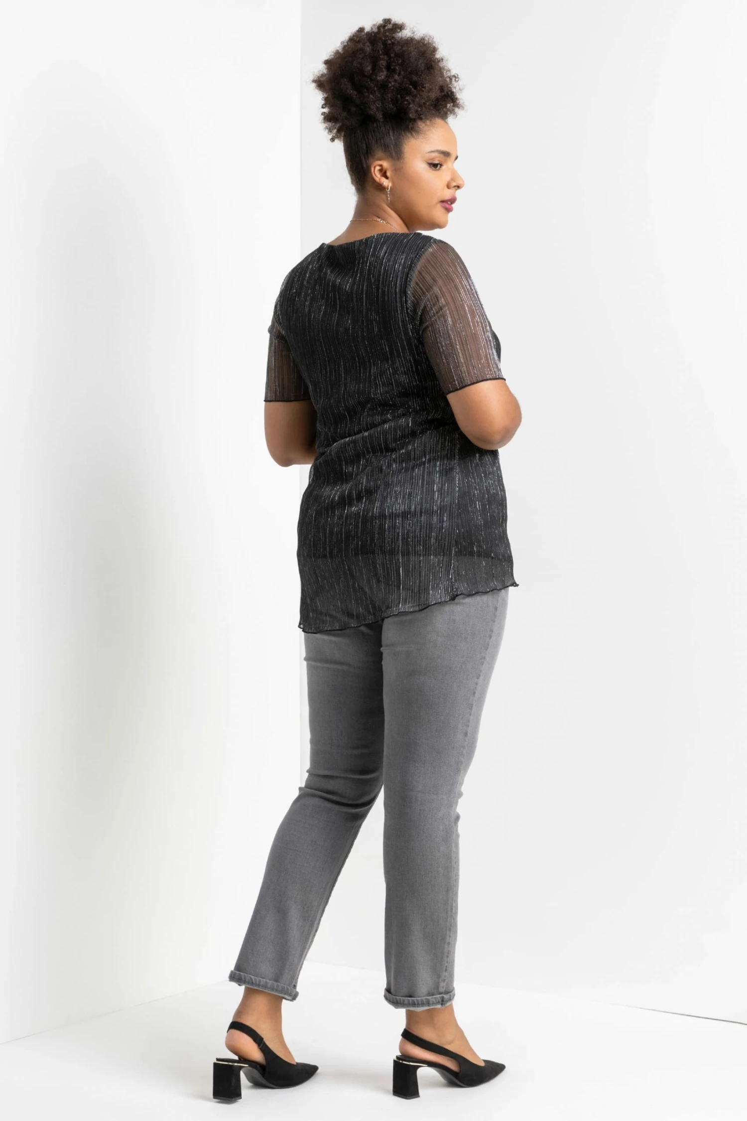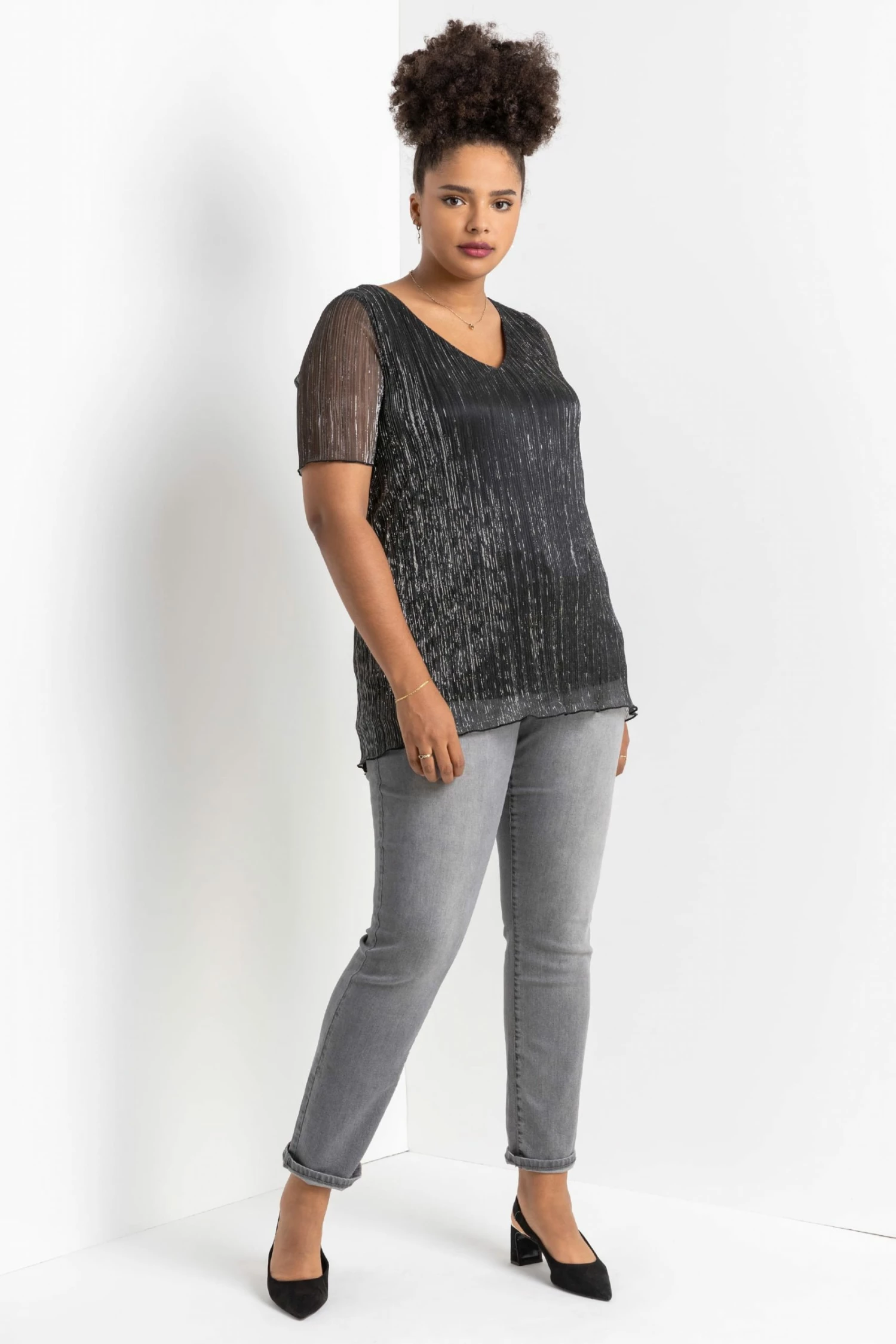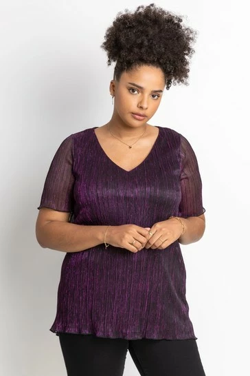 Add effortless glamour to your wardrobe this season with a shimmering ombré number. Cut with a flattering v-neckline and sheer short sleeve, this Curve blouse boasts a delicately pleated bodice and shimmer surface, giving it a beautifully feminine feel. Perfect to throw on over faux leather leggings or dress up in the evening, this ombre top is as versatile as it is striking. Ideal for your Christmas party, pair with the matching plisse cover-up jacket and some wide-leg trousers!