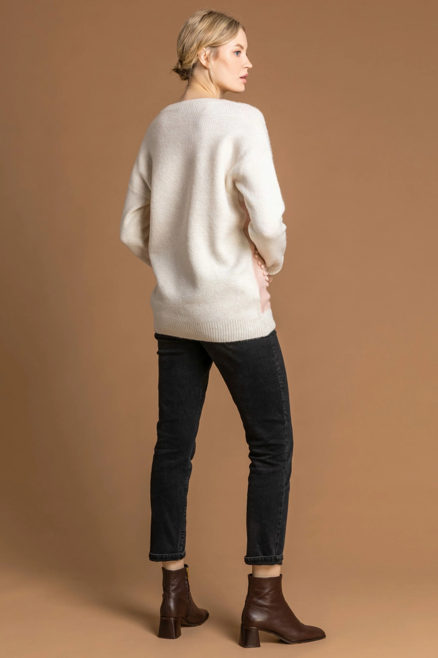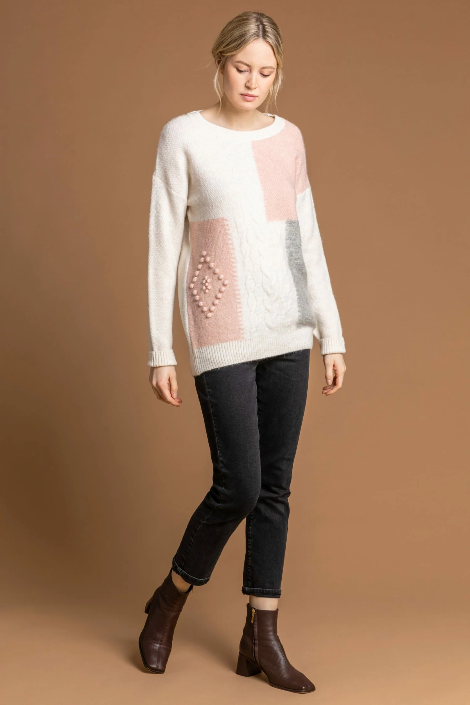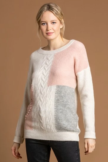 Refresh your seasonal knits with this cosy cable knit piece. Crafted from a soft handfeel yarn with full length sleeves, this chunky knitted jumper combines colourblock print with a cosy pom pom texture in trendy panels. The comfy crew neckline and cuffed silhouette will keep the warm in when the cold weather hits. Layer up your look with a textured teddy coat for a crisp winter walk with the family!