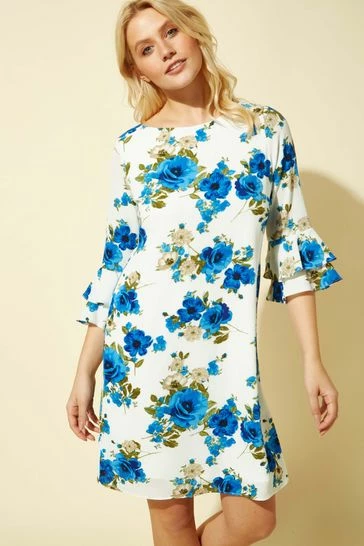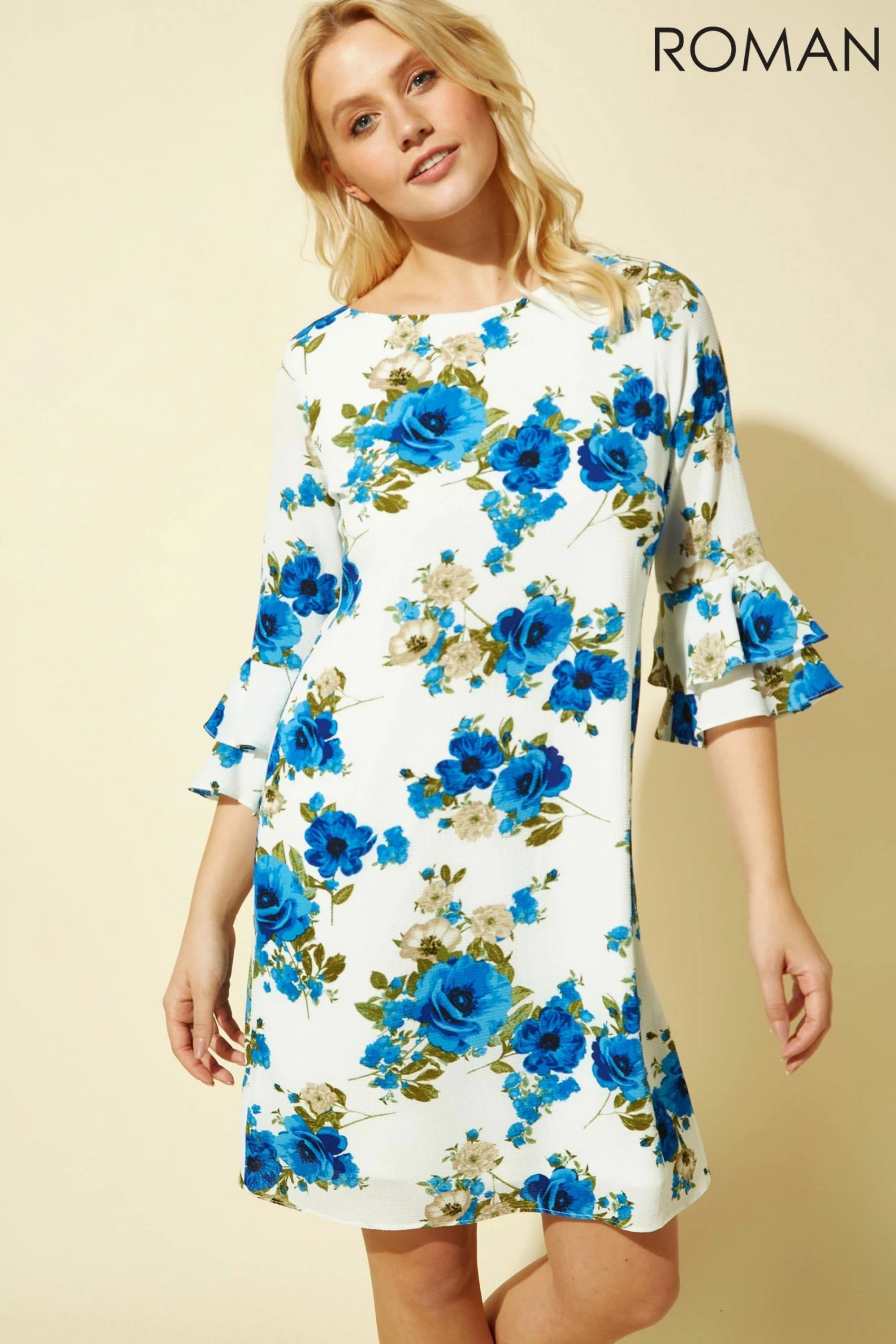Steal the show in our latest occasion dress. Itβs rose design contrasts perfectly against the ivory background to make a beautiful feminine number, with fluted sleeves this occasion dress is knee-length making it perfect for the warmer weather. The round neckline with button loop fastening means this dress is worn overhead, providing effortless sophistication and fuss-free wearing. Pair with your favourite Roman sandals to create a stunning seasonal look.