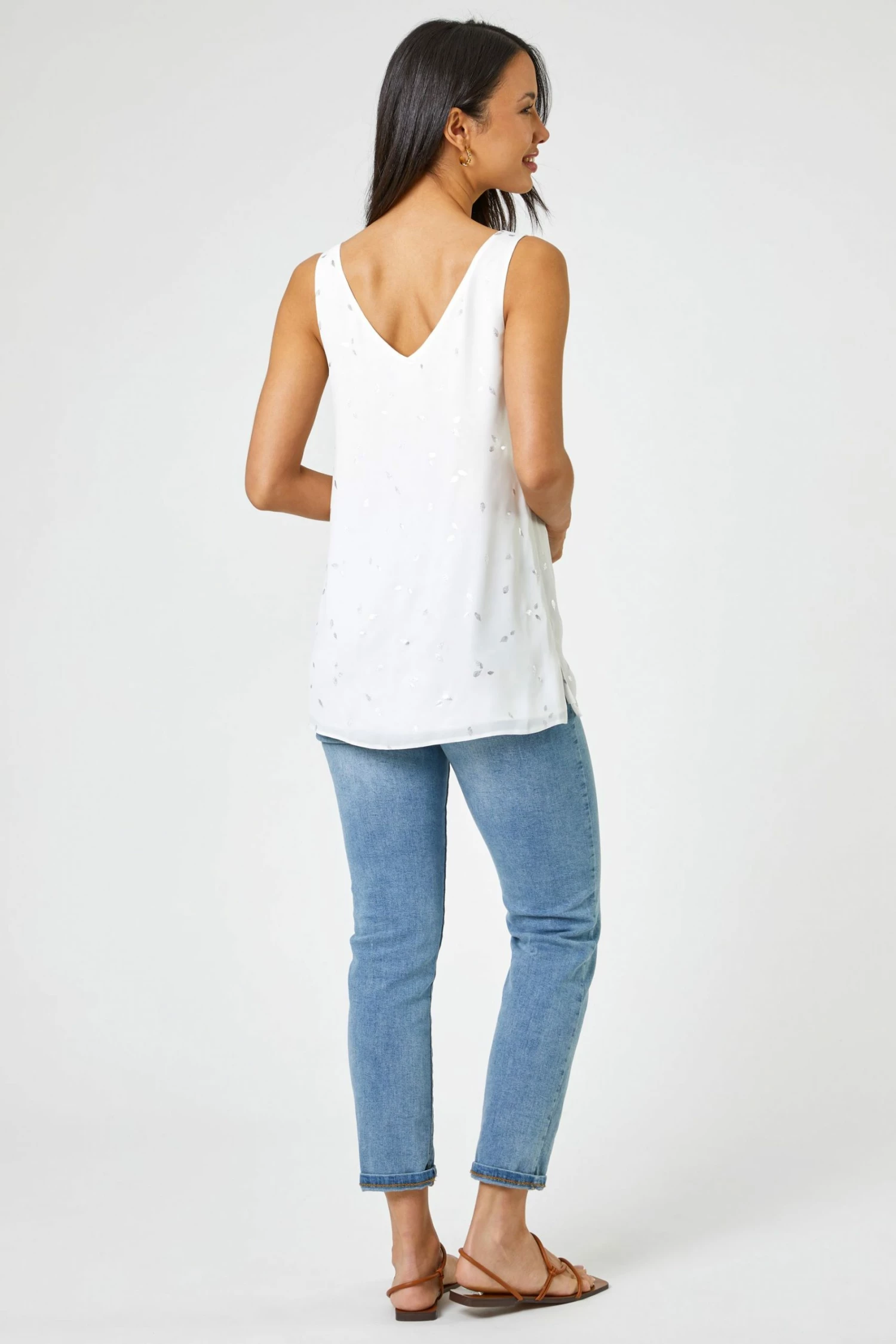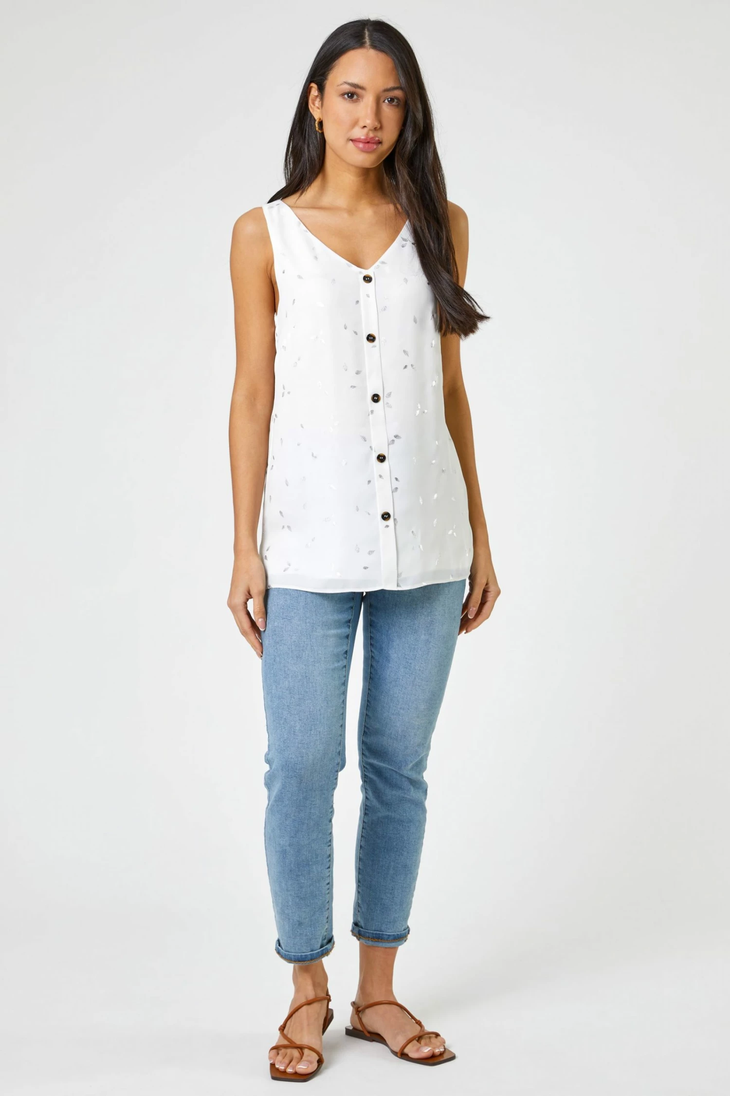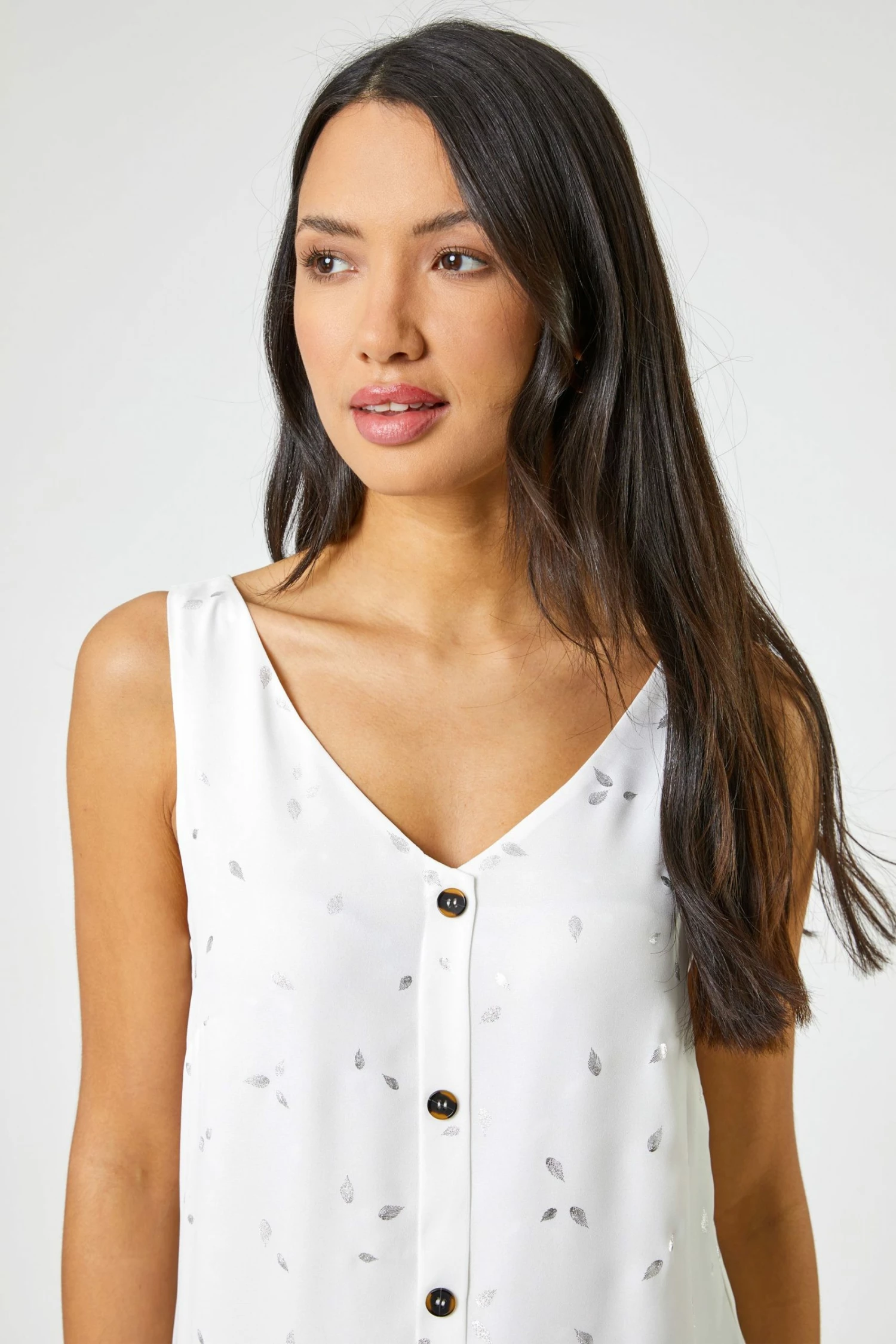 Enjoy this sweet twist on our classic sleeveless style that is a perfect addition to your casual collection. Featuring a soft v-neckline, with an all over scattered foil print and button detail down the centre front, this vest top is a sure winner. Style this wardrobe must-have with cropped stretch trousers or jeans for those warm sunny days out or a sunny getaway when your ready for your next trip abroad!