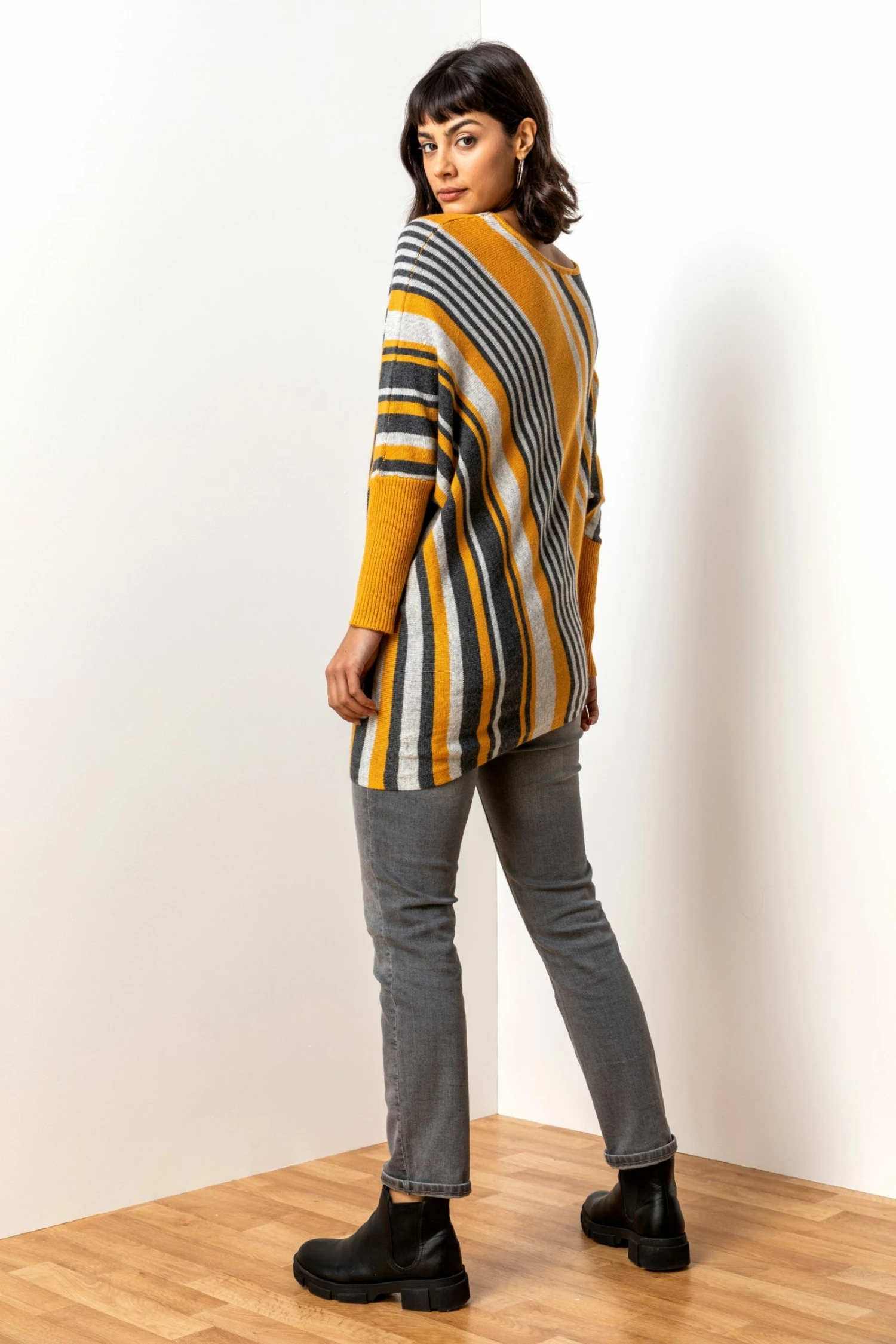 Delve into autumn winter knitwear with this colourful stripe number! Brightening up the dullest of days, our long sleeve sweater is adorned with a trendy diagonal print following the asymmetric hemline. Flattering through the body, this cosy new layer has lots of stretch and an easy round neckline to pull on for casual days out. Simply pair with black denim jeans for a day to night outfit.