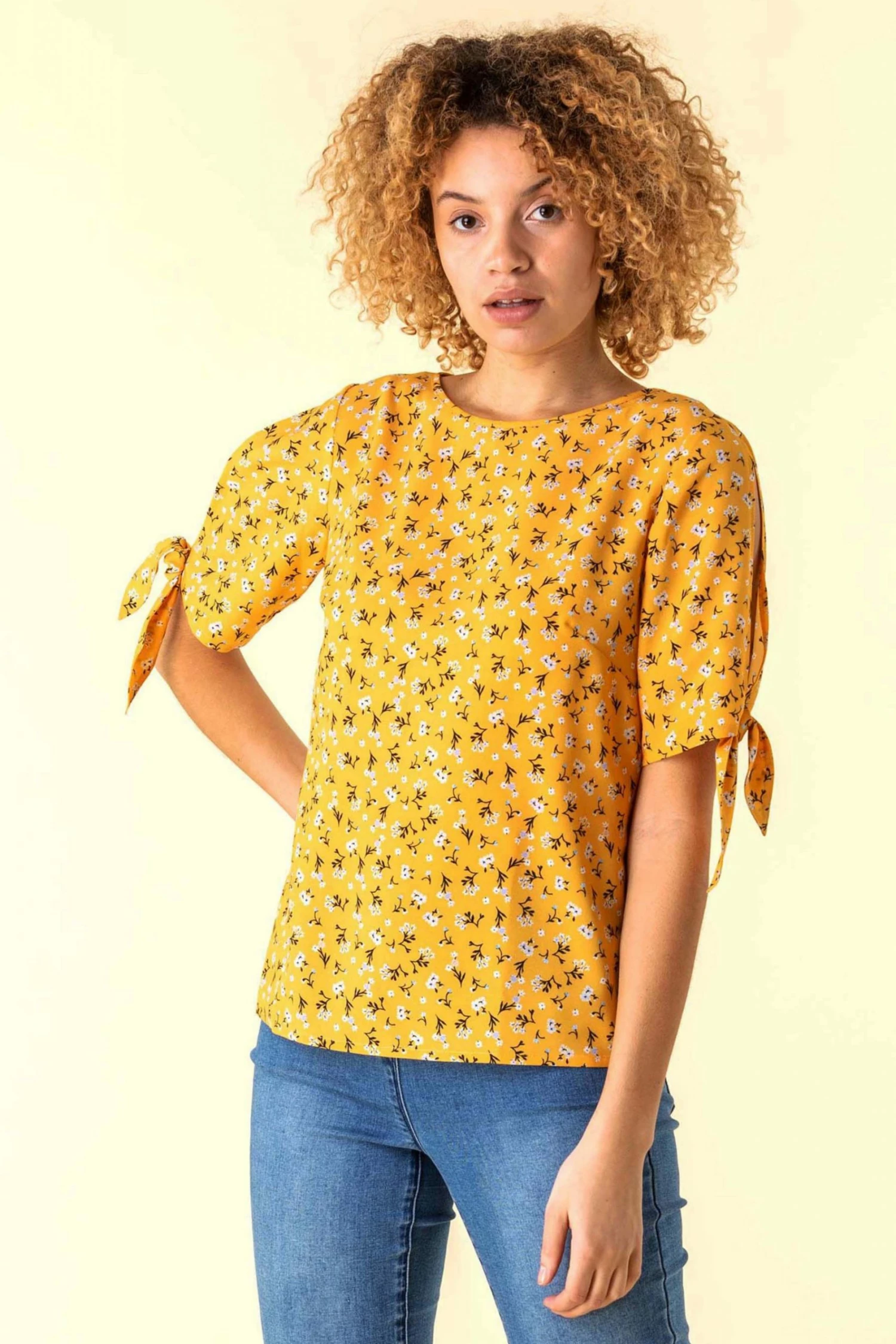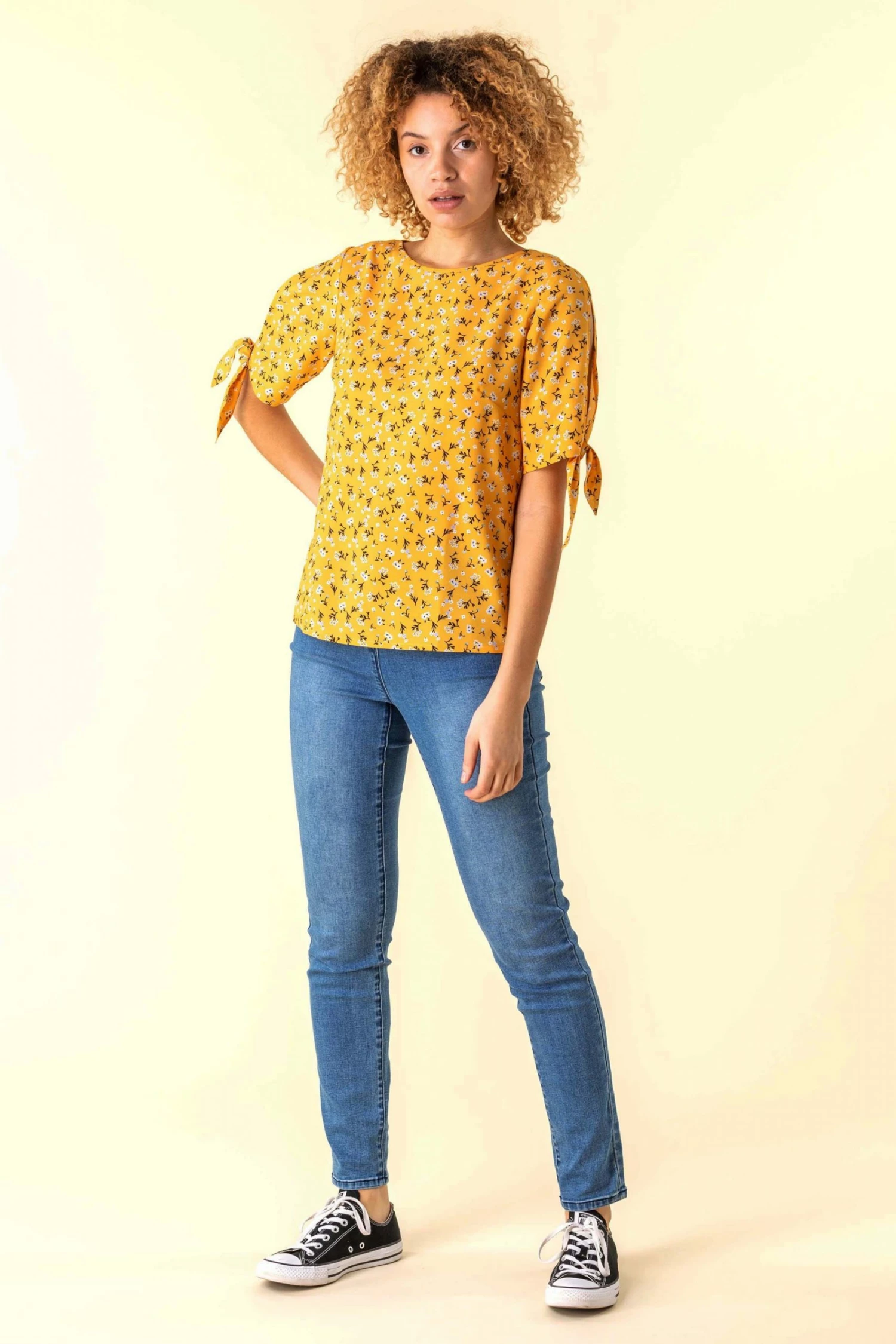 A pop of colour and a beautiful ditsy floral pattern, this top is an essential part of your springtime wardrobe. Cut to a relaxed fit and featuring an all over flower print, this top comes with short sleeves with an adorable tie detail to the arms. Stay cool during the warmer months and wear with cropped trousers and pumps for the perfect daytime look.