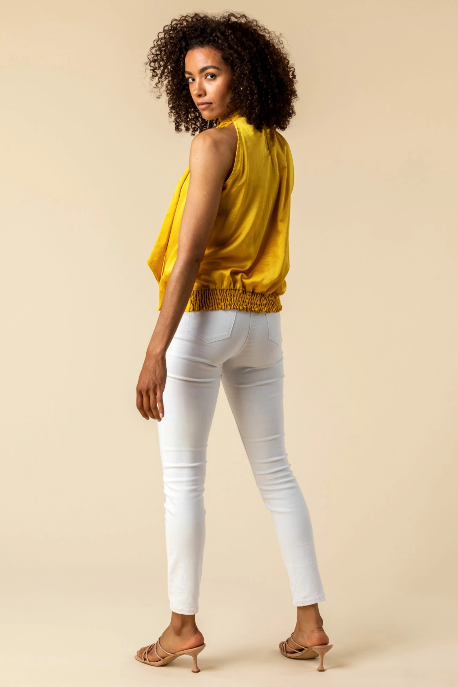 A stunning shade for summer, this vibrant top has a gorgeous tie neck fit and flattering shirred waistline. Perfect for when the weather gets warmer, this sleeveless style can be worn on its own or with a light shrug on the evening. A staple piece for taking abroad, our new tie neck top has a flattering high neckline which makes it perfect for covering the bust. Complete the look with a floaty a-line skirt or keep it casual with a white cropped trouser and statement earrings!