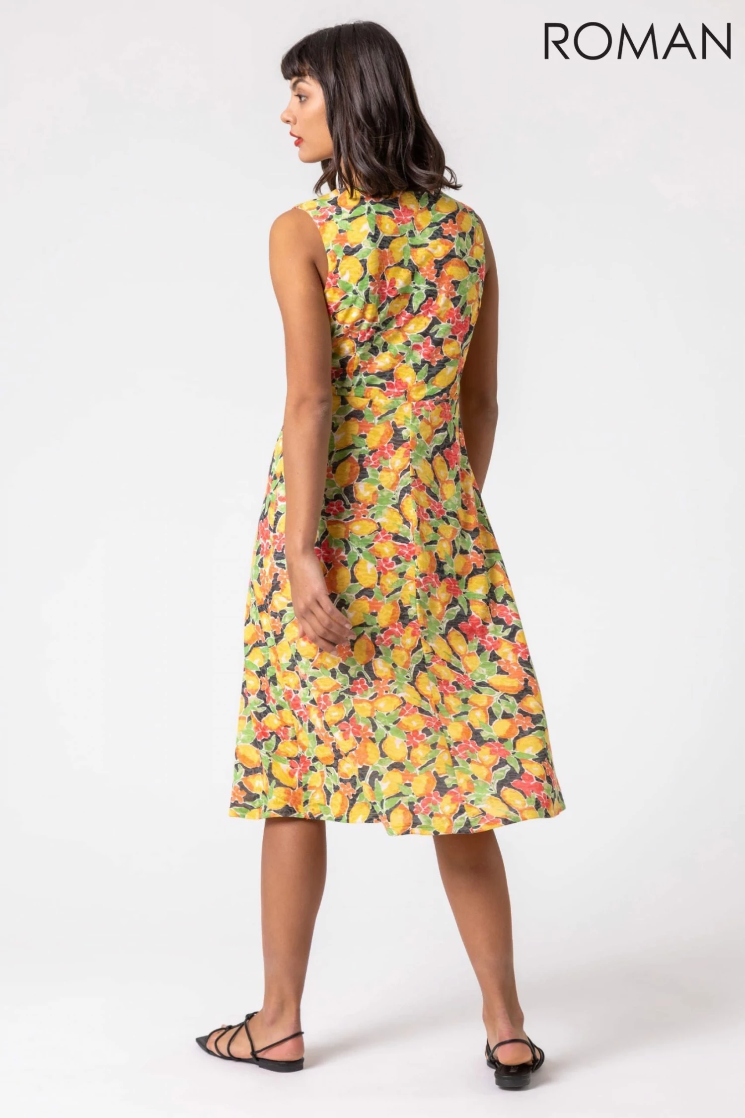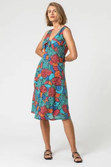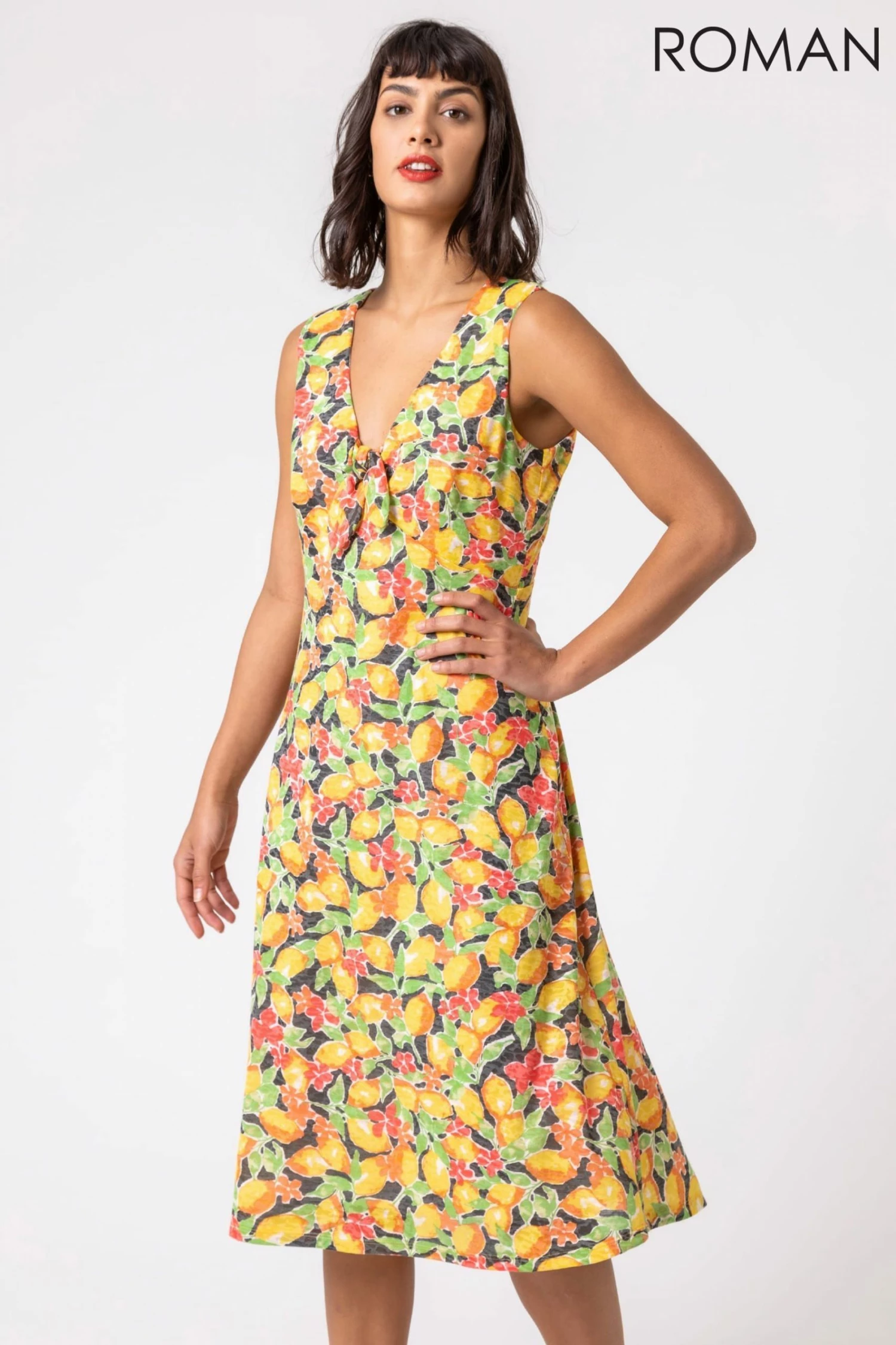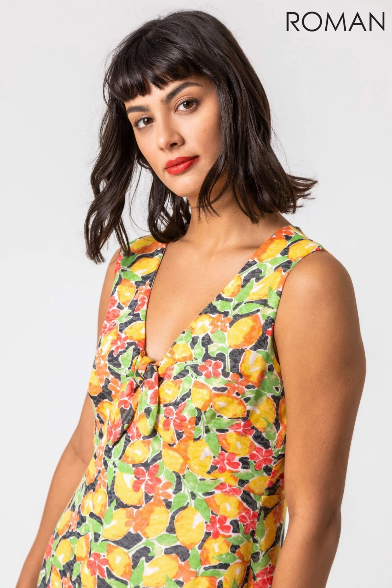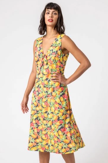 A tropical dream to transport you to somewhere hot and sunny, this tropical fruit print dress has summer written all over it. Featuring a knotted tie detail at the bust and an all-over burnout pineapple print, this fit and flare dress is made from a jersey fabric making it easy to pull on over the head. Pair with your favourite sandals and a sun hat for a beach look to turn heads.