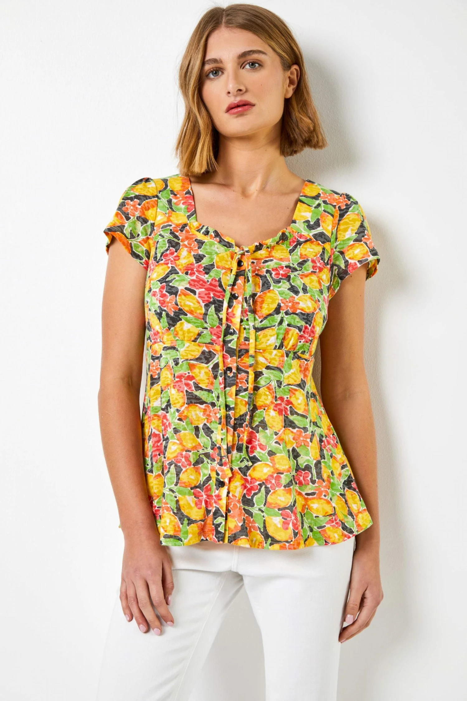 Refreshing summer prints and lightweight tops make for the perfect key piece this season. Our lemon burnout print top features a soft sweetheart neckline finished with a frill trim, centre bust tie detail and short sleeves. This button down front, with a central seamline creates a soft fit and flare peplum shape. Perfect for those summer days out, paired with blue or white denim jeans, this top can take you from bar to beach in a matter of seconds.