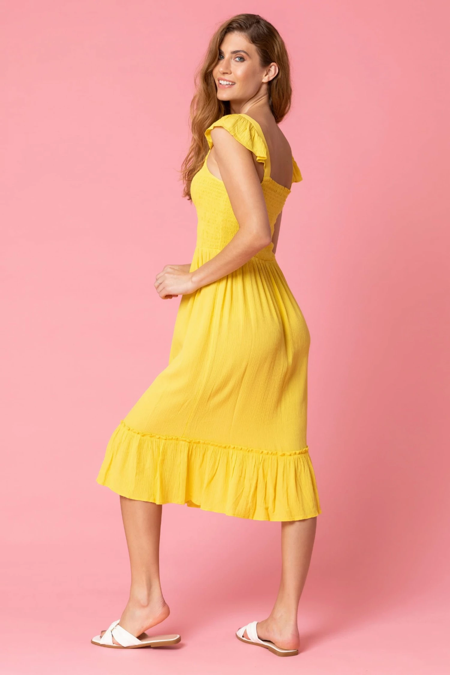 Make sure to pack this holiday essential with you this season and add that pop of colour to your wardrobe. Cut from a crinkle textured fabric, this midi-length dress has a comfortable shirred bodice with frill detail to straps and hemline. Pair yours with your favourite sandals and a denim jacket for a stylish everyday look.